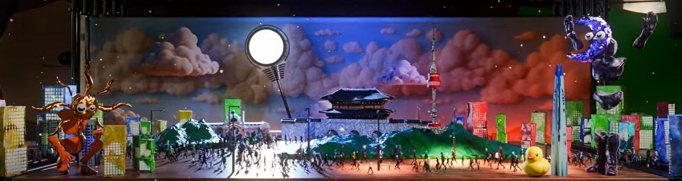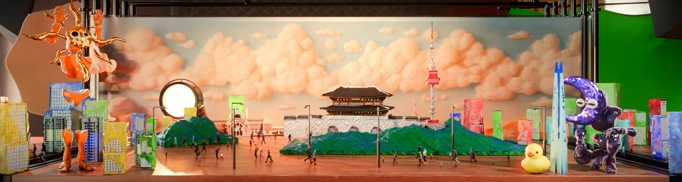 서울의 하루를 하나의 살아 숨쉬는 빛의 순환으로 보고, 해 달의 아이가 번갈아 도시를 비추며 서울 시민들의 움직임을 책상 위